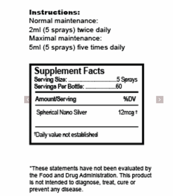Our Nano Silver Spray 4 oz. is not like most silver. Most silver available on the market today contains silver ions. That type of silver is in an atomic state and has no crystalline structure. Our silver technology contains a nano-sized crystalline metallic core made of .9999 pure silver, surrounded by a silver-oxide coating (silver and oxygen combined together). This skin-like coating gives the silver its stability and unique properties unlike any other silver technology. This creates nanostructured spherical silver in a form that is perfectly suitable for human consumption. Our Spherical Silver Nanoparticles have the size and shape (7-10nm spheres) needed to: